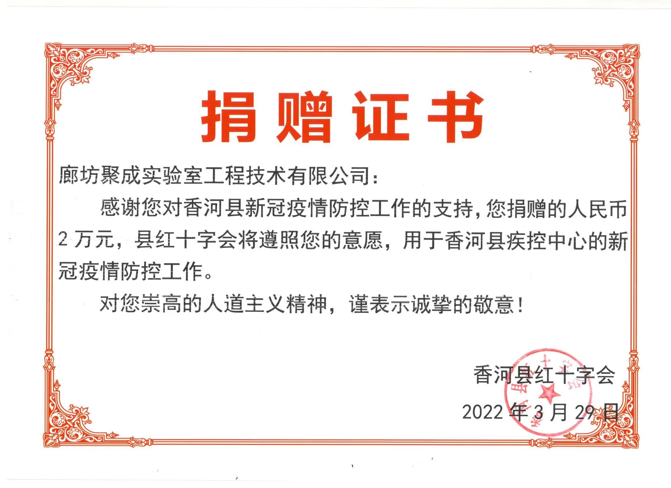 2022年3月8日,廊坊突发疫情,随即香河在内的各市县开始全域封控,北京成威感念防控不易,向香河县疾控中心捐赠两万元人民币用于新冠疫情防控工作。